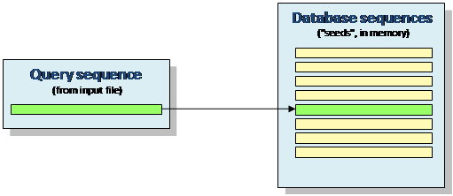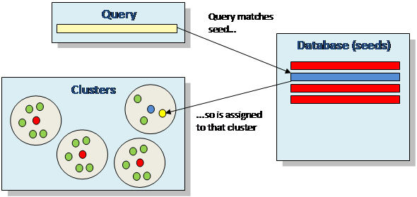 You can initialize the seed database from an existing set of sequences (the library). Clustering is then pretty much the same thing as database search: UCLUST attempts to match each query sequence to a seed. The main difference is that by default, UCLUST stops when it finds the first hit, while most database search programs try to find all hits. The first hit is usually the best or close to the best possible hit, but this is not guaranteed (see the discussion of the --maxaccepts and --maxrejects options above).