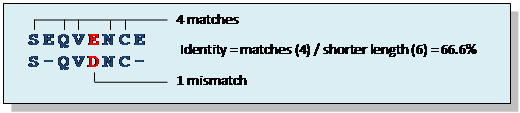 The two hits are both 100% identical to the seed in a pair-wise alignment (see later sections for a more detailed discussion of identity). However, the hits are extended with different terminal regions (red) and therefore have only about 50% identity to each other.