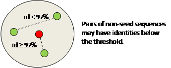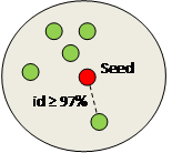 Each cluster is defined by a representative sequence called a seed. Each sequence in a cluster matches the seed according to the identity threshold, e.g. 97%.