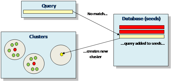 UCLUST performs de novo clustering by starting with an empty database in memory. Query sequences are processed in input order. If a match is found to a database sequence, then the query is assigned to that cluster (first figure below), otherwise the query becomes the seed of a new cluster (second figure below).