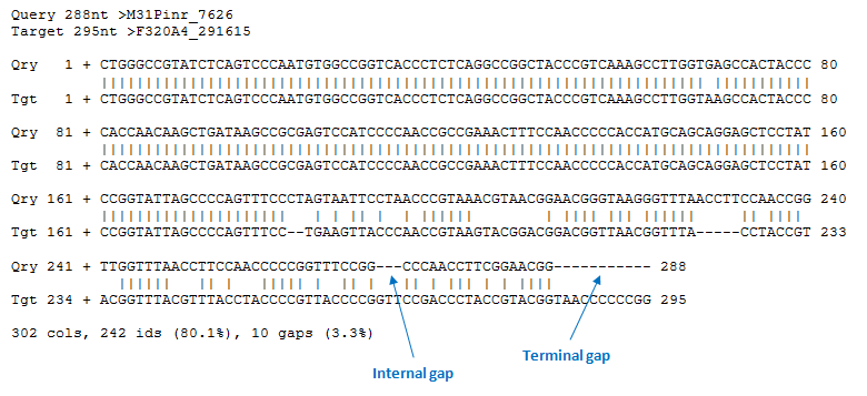 The global alignment below has terminal and internal gaps indicated. The - show_termgaps option was used for the - alnout output file. Note that the number of columns (302 in this example) is always reported without terminal gaps, as these are the columns used to calculate identity .