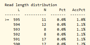 length, N=number of reads, Pct=fraction of reads with this length, AccPct=fraction