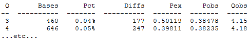 each Q score in the FASTQ files, the number of bases and number of diffs