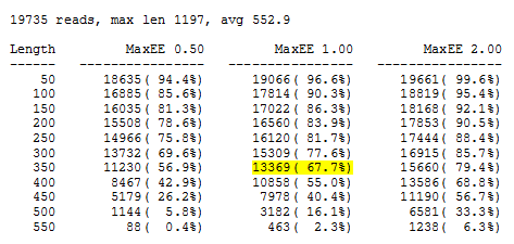-fastq_maxee 1.0 and -fastq_trunclen 350 used in run_uparse.bash (below).