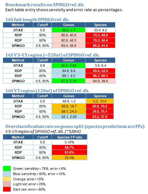 UTAX, RDP and SPINGO compared on 16S genus and species